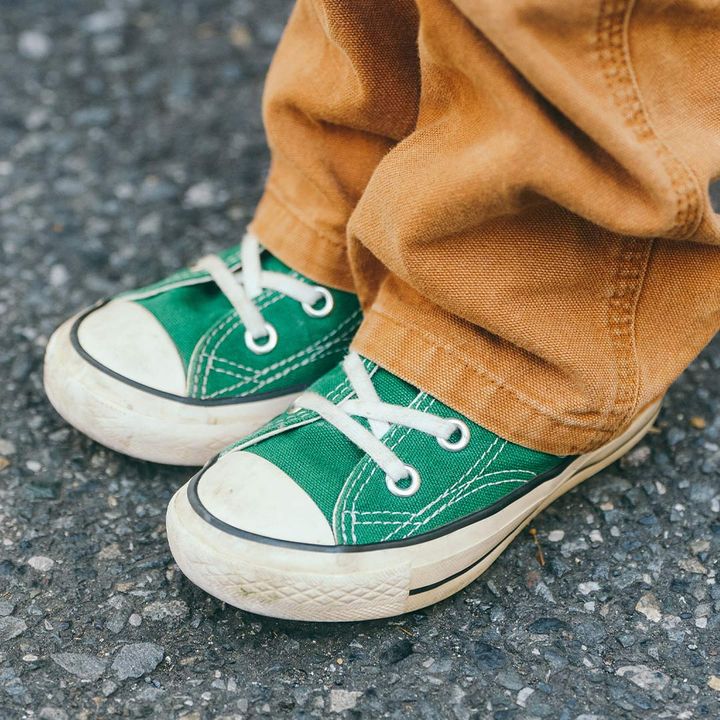 『コンバース』のスニーカーは鮮やかなグリーンをチョイス。キャメルカラーのボトムスとのコントラストが新鮮♪