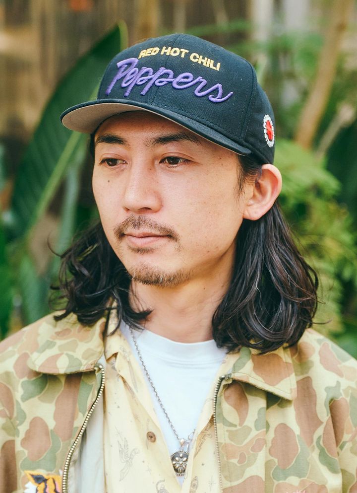『レッド・ホット・チリ・ペッパーズ』のキャップで個性を発揮! パープルの刺しゅうロゴが、ロックなスパイス役に大活躍。