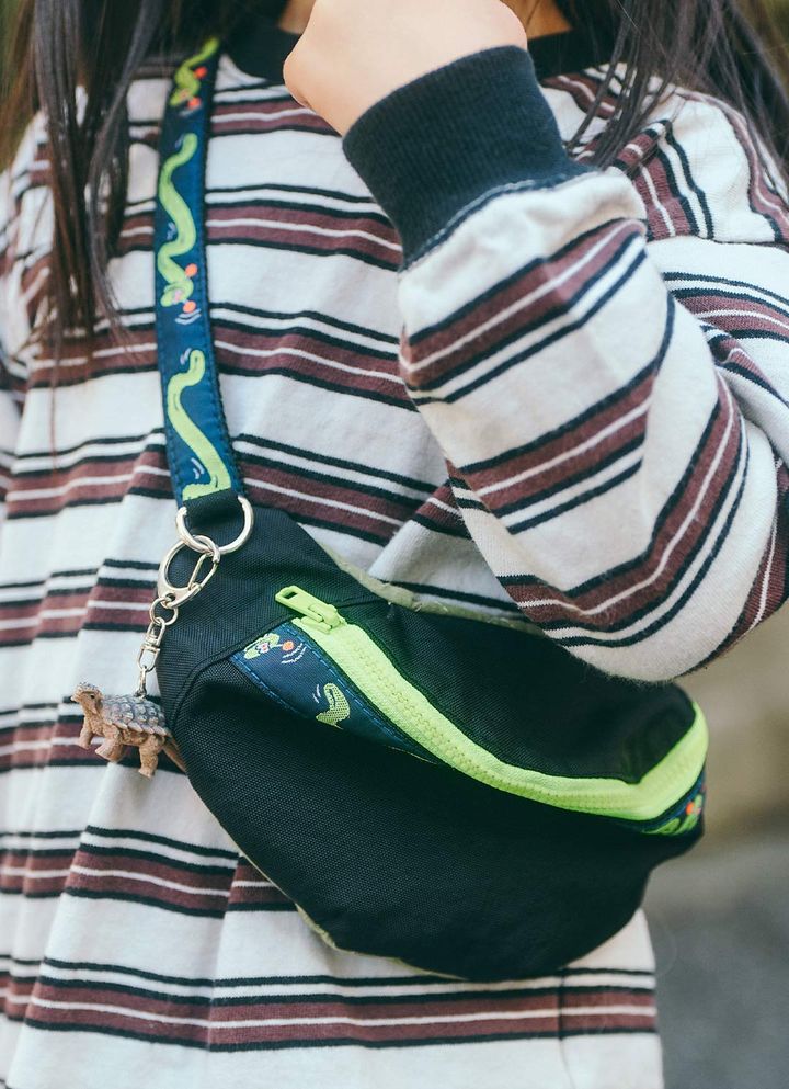 『メルニー』のバッグは、ネオングリーンのジッパーと刺しゅうストラップが遊び心たっぷり♪ 恐竜のキーホルダーを連れて、オリジナリティも忘れずに。