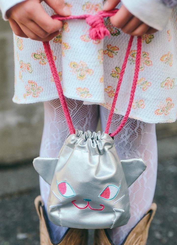 シルバーのネコモチーフバッグは『カルディ』で購入。ピンクの紐が好アクセントに、キッズの「好き」が詰まったアイテム。