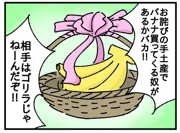 しかし謝罪先で待っていたのは、まさかのゴリラ。「ヨッシャア!! 相手がゴリラだったぞ!!」と喜ぶのも束の間、バナナを目にしたゴリラは「こういう時って普通メロンとかですよね?」と不満を滲ませた。どうやら相手がゴリラでも、バナナでの謝罪は通用しないらしい。
