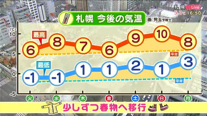 今週は季節が春へ一歩進みそうです。札幌の気温変化を見ると、最低、最高気温とも平年より高い日が多いでしょう。日中は5度を超え、週末は10度くらいまで上がります。朝もプラスの日が多いでしょう。少しずつ、上着や靴など春物に移行しても良さそうですね。