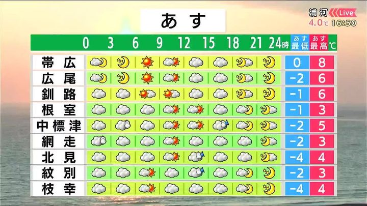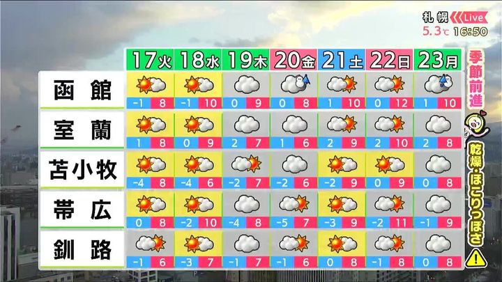 ※16日午後5時時点の情報です。最新の気象情報は、HBCウェザーセンターのホームページなどでご確認ください。HBCは気象庁の認可を2001年に得て以来、民間気象会社の一つとして「HBCの独自予報」を発信しています。