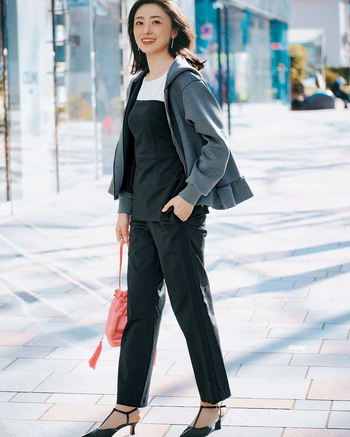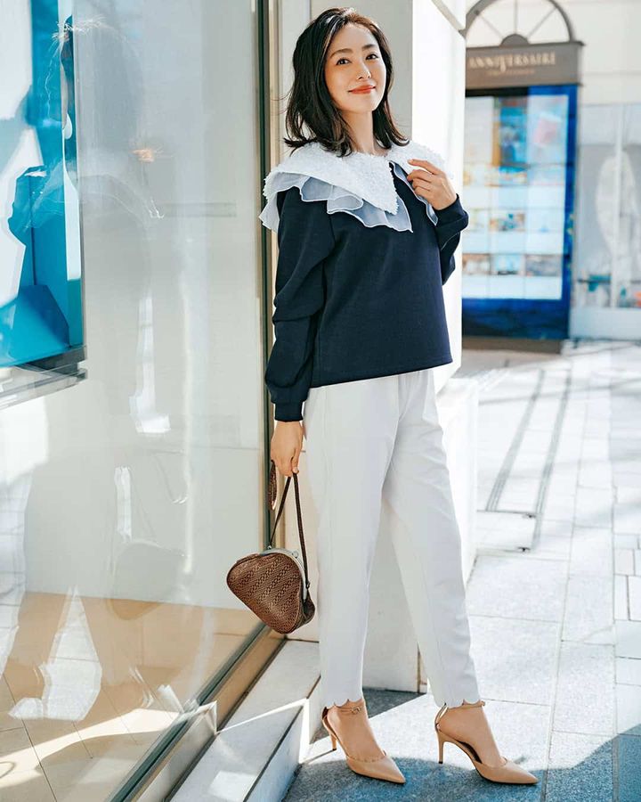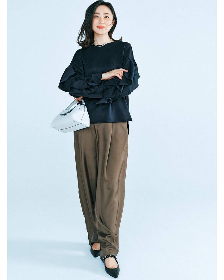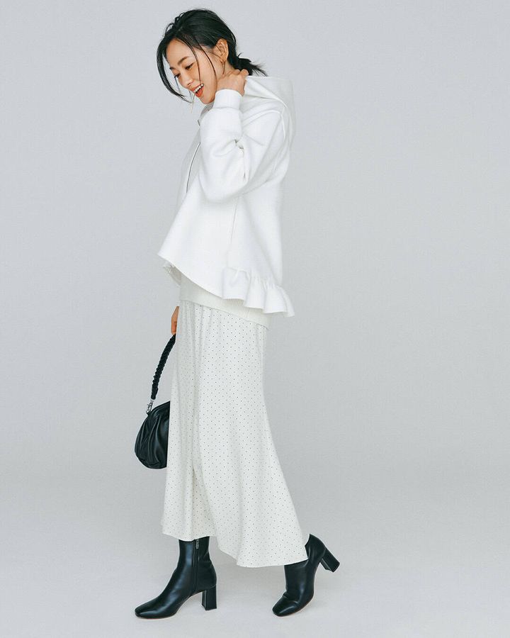 裾にあしらったフリルの甘さで、カジュアル服が苦手な人でも取り入れやすいデザインに。程よい厚みのポンチ素材は着られる時期も長く、屋外のイベントでも重宝します。美シルエットながらポケット付き。