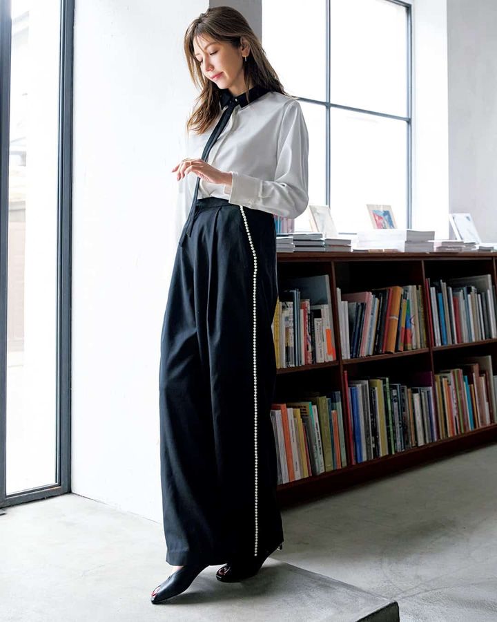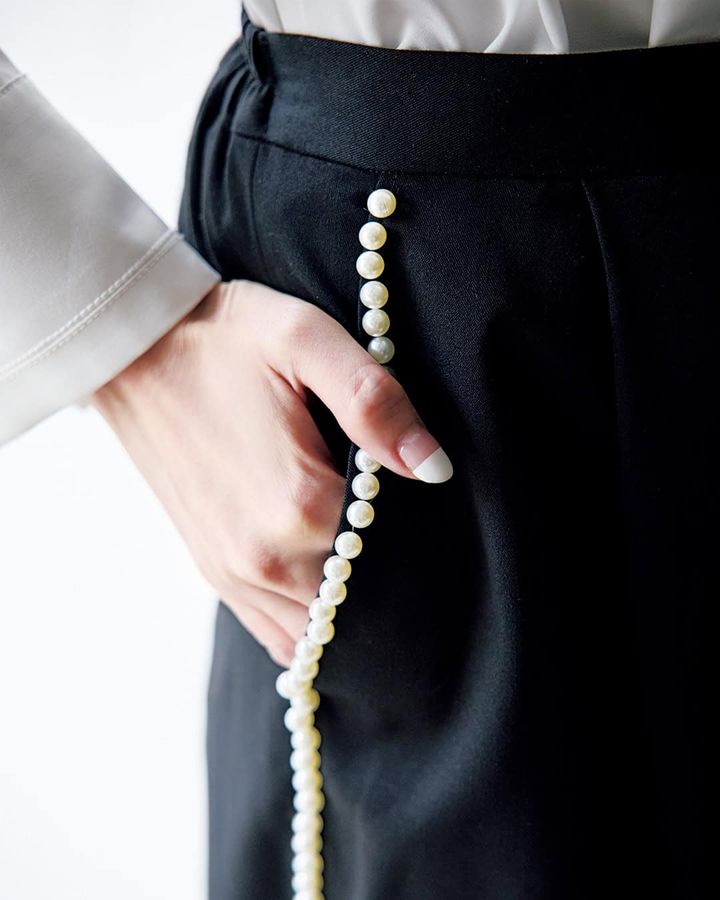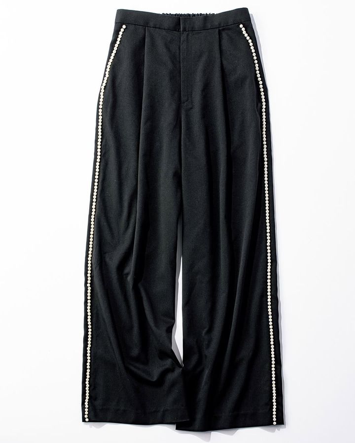 ③これならカジュアルになりすぎず、品のいい甘さをまとえる「パールパンツ」