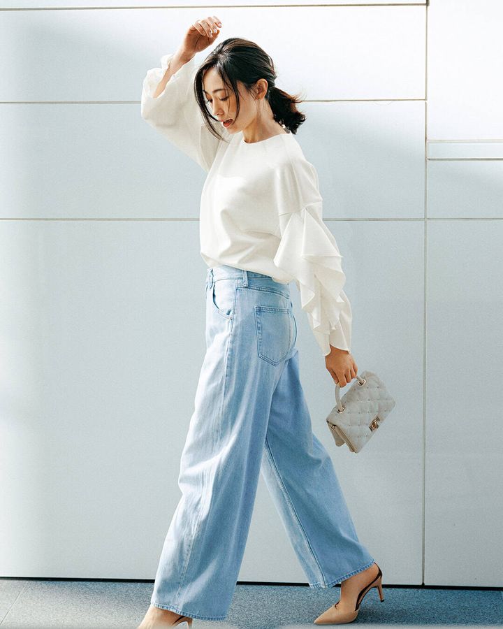⑫デニム合わせでも、きちんとシーンでも着回せる「袖フリルトップス」