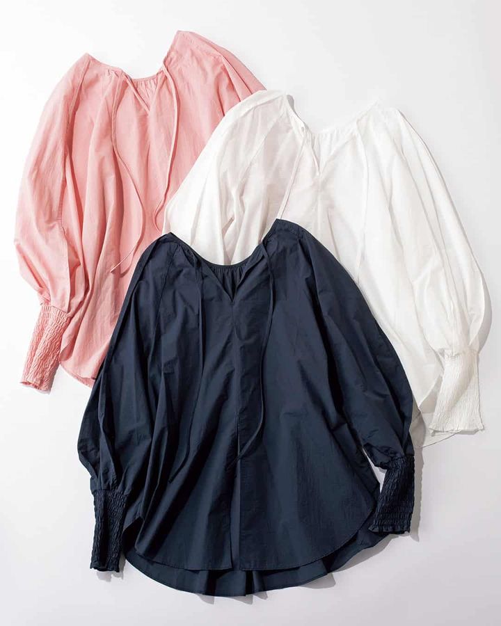 柔らかいコットンレーヨン素材を使用し、シワになりにくい。首元のボタンを開ければ、コーデに抜け感が加わり、ボリューム袖で手首をほっそり見せる効果も。自宅でのイージーケアも嬉しい。