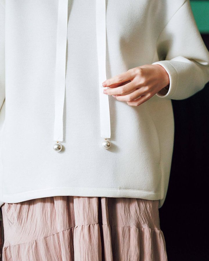 シートロで人気の高いボンディング素材を使用したフーディ。大人が着ることを考え、カジュアルになりすぎないのがポイントです。そのため構築的で体のシルエットを拾わないようにしたり、スピンドルの代わりにベロア素材のリボンを使用し、さらにリボンの先に大粒のパールを付けたり工夫を重ねました。ボンディングは軽いので着やすいのも魅力です。