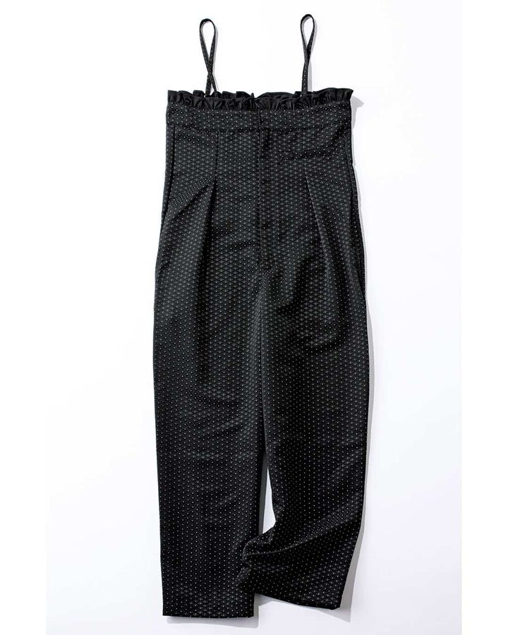 小さなドット柄がさりげなく映える、フェミニンなサロペット。細めの肩紐とワイドシルエットで大人っぽく着られます。胸元のプチフリルやフロントのタックなど小技の利いたデザイン。