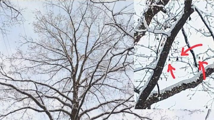 雪が残るハンノキ属の木と枝先のアップ(右上)(平岡公園にて撮影)枝のアップ中央付近に小さな塊のように見えるものが花粉が入っている雄花の集まりです。