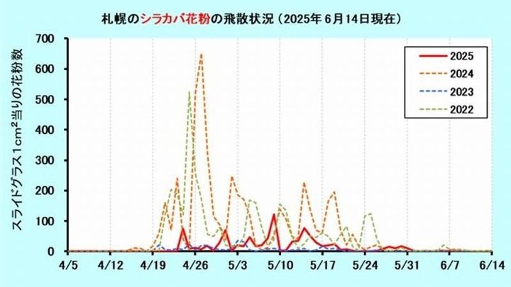 さらに、シラカバ花粉の飛散量は 多い年と少ない年が交互に現れる傾向が見られます。