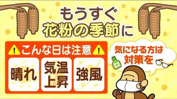 特に花粉が飛びやすい3つの条件、「晴れ」「気温が上がる」「風が強まる」がそろうときには十分な注意が必要です。