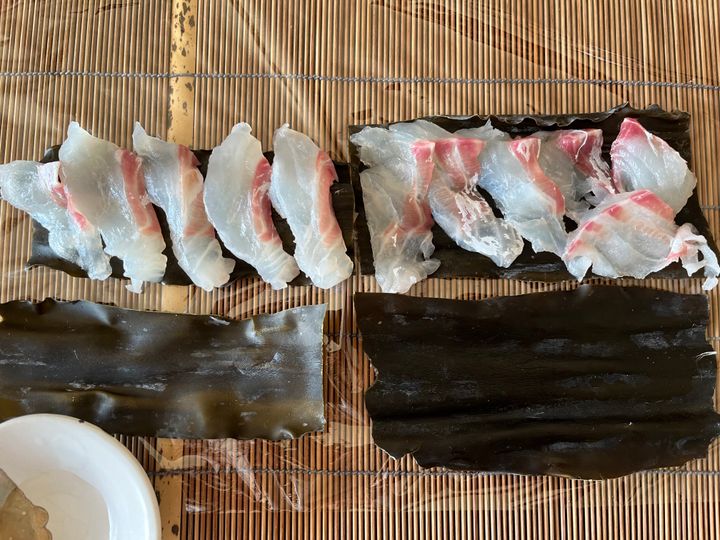 (4)バットに並べて重しを乗せ、冷蔵庫で3~4時間なじませます。昆布を剥がし器に盛ってお好みでわさび醤油や塩、柚子胡椒などをつけて召し上がれ。