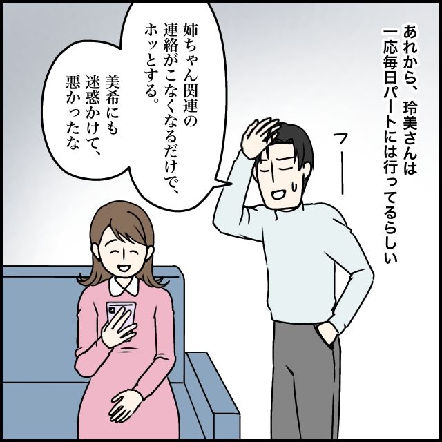 あれから、玲美さんは一応毎日パートには行っているそうです。太一も「姉ちゃん関連の連絡がこなくなるだけでホッとする、美希にも迷惑かけて悪かったな」と肩の力が抜けた様子。こうしてようやく、私たちのもとに穏やかな日常が戻ってきました。