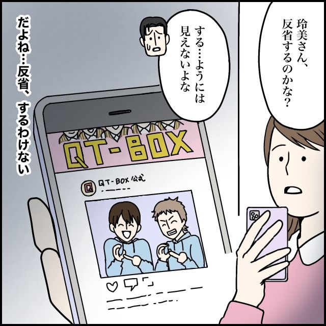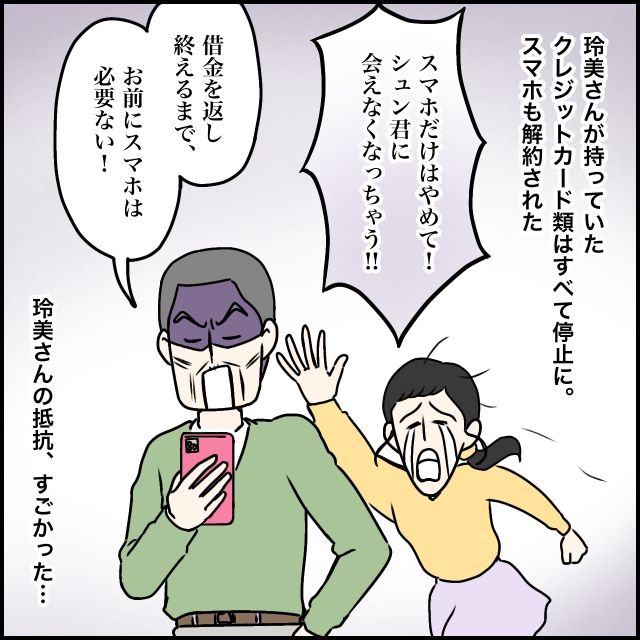 玲美さんが所持していたクレジットカード類はすべて利用停止となり、スマホも解約されました。「スマホだけはやめて!シュン君に会えなくなっちゃう!」と激しく抵抗する玲美さんでしたが、それを上回る義父の怒りに押し切られ、ついに推しとのつながりが完全に断たれました。