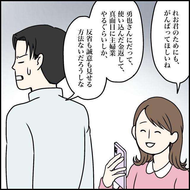 「れお君のためにも、がんばってほしいね」そう声をかけると、太一は少し呆れた様子で「勇也さんにだって使い込んだ金返して、真面目に主婦業やるぐらいしか、反省も誠意も見せる方法ないだろうしな」と言いました。