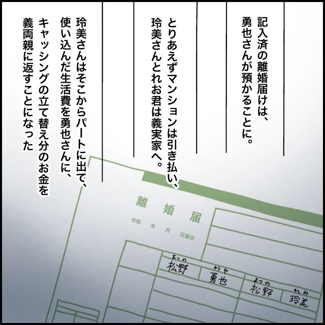 記入済の離婚届は勇也さんが預かり、ひとまず今住んでいるマンションは引き払うことに。勇也さんの異動の目途が立つまで、玲美さんとれお君は義実家で暮らすことになりました。玲美さんはパートに出て、使い込んだ生活費を勇也さんに、キャッシングの立て替え分のお金を義両親に返すことになりました。
