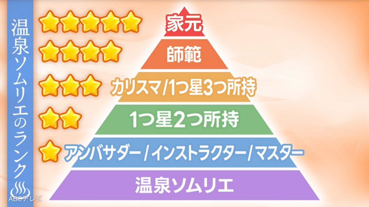 スギちゃんいわく、温泉ソムリエは全国に約3万3000人もいるが、ランクは“星なし”から“5つ星”まであり、“4つ星”以上の獲得者はごくわずか。その中で彼は、14人しかいない”3つ星”獲得者こと”カリスマ温泉ソムリエ”の1人だ。