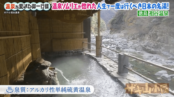 “美肌の湯”である祖谷温泉の泉質は、アルカリ性単純硫黄温泉。スギちゃんによると、「肌っていうのは酸性なんです。アルカリが入ることによって中和される。そうすることによって、古い角質が溶け出す。ゆえにキレイなお肌になります」とのこと。