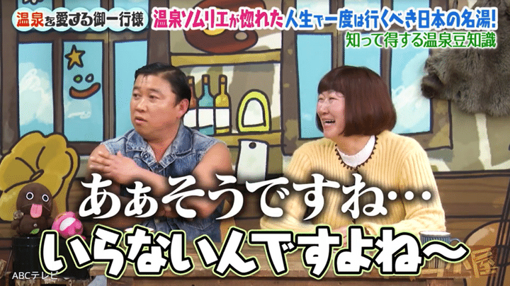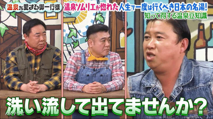 ほかにもスギちゃんは、「塩化物泉は保湿とかいらないです。もうツルツルのままです」とキッパリ。一方で、彼から同意を求められた温泉ソムリエ“1つ星”の川村エミコ(たんぽぽ)は、「あぁ~そうですね~……」と断言を避けたため、ザキヤマは塚地武雅(ドランクドラゴン)とともに、「なんか(テンションに)差があるんですけど」「不安なの?」「あんま乗ってないけど」「言い切っていいのかなみたいな」などとツッコみまくった。