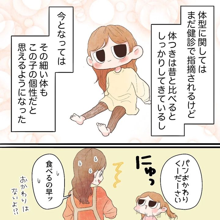 偏食ではあるので、客観的に見たら「いやいやもっとバランスよく食べさせなさいよ」って思われるかもしれませんが、「このままじゃ死んじゃうんじゃないか」と毎日心配していた時期を思うと、今これだけいろいろ食べてくれて、「これが好き」「これが美味しい」と言ってくれることが、本当に嬉しいそう。「あのときの自分に、今のメメを見せたい」 でももし…、もし今のメメの姿を知ることができたとして、まろは気楽になれるのでしょうか?