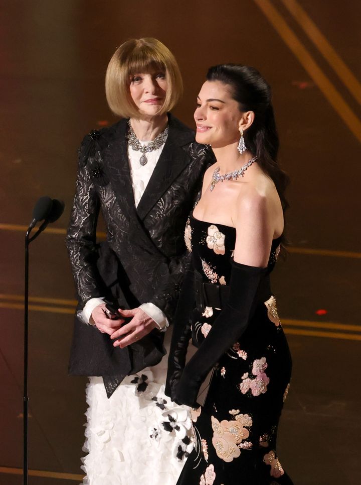 昨年の受賞者をはじめ、豪華なセレブがプレゼンターとして登場するのもオスカーの見どころ。今年は衣装デザイン賞とメイクアップ&ヘアスタイリング賞のプレゼンターとしてアン・ハサウェイと大御所編集者アナ・ウィンターが登場した。