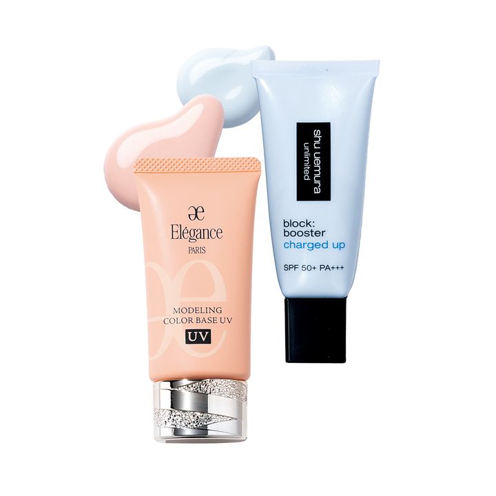 「伸びが良く主張しすぎないカラープライマーで、アラを隠すのがマスト。ブルーは顔色が悪くならず、透明感を引き出して赤みも打ち消すシュウをセレクト。オレンジは透け感とカバー力のバランスが優れたエレガンスを。白浮きせずに沈んだ肌色を補整してくれます」(AYAさん)。左:温もりのあるヘルシーな印象へ。モデリング カラーベース UV OR220 30g ¥5,500() 右:独自のブルーパールが◎。アンリミテッド ブロック:ブースター アドバンスト ルミ ブルー 30ml ¥5,830※3/4発売()