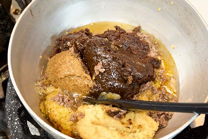 墨田区曳舟にある「蕎麦割烹 ながの」の周りには相撲部屋も多く、店主・永野清二さんも以前から好んでつくっていたという力士味噌は、挽き肉の旨味と3種の味噌の風味で重層的な味わいで、豆板醤と唐辛子のピリ辛がアクセント。「ゆでたうどんにのせてジャージャー麺風にして食べてもおいしいですよ!店の賄いによくつくっています」(永野さん)。