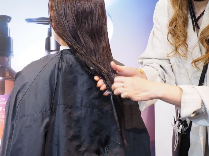 今回の発表会に登壇したモデルさんのようにロングで毛量が多い人の場合は、一回に4プッシュ、もう少し短い場合はトータル3プッシュが目安なのだそう。まずは3プッシュを手に取り、髪の傷みが気になる毛先になじませていきます。