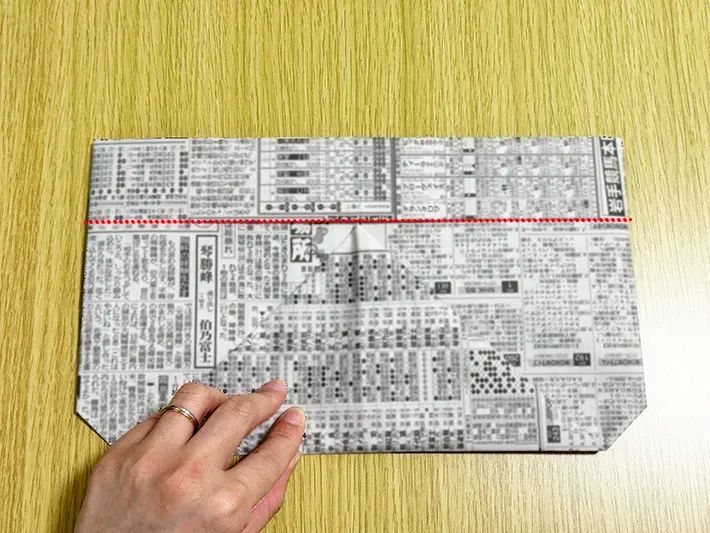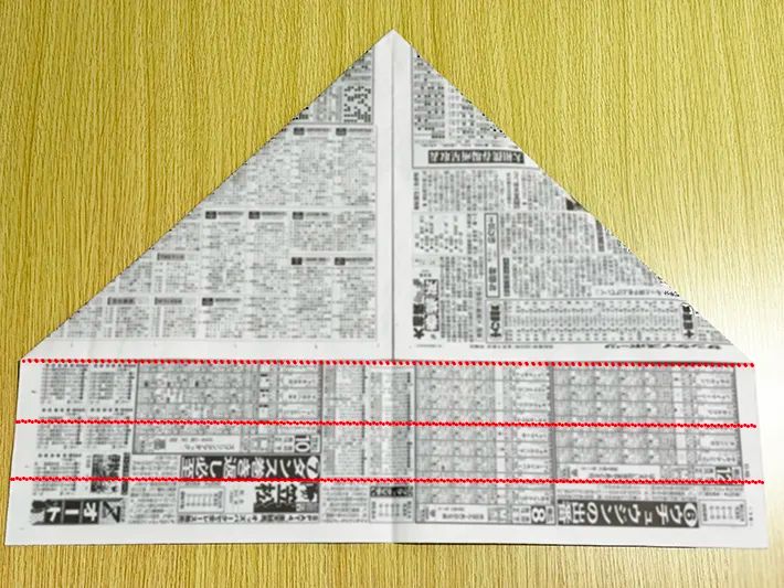 新聞紙の下側を、画像に引いた線を参考に3回折りましょう。