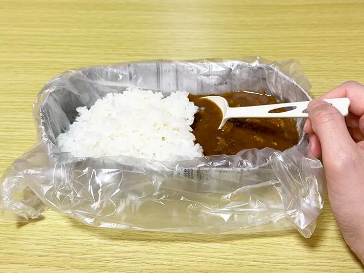 その上にご飯とカレーのルーをのせました。災害時を想定し、スプーンもプラスチック製に。穴が開くことなく、きれいに食べられました!