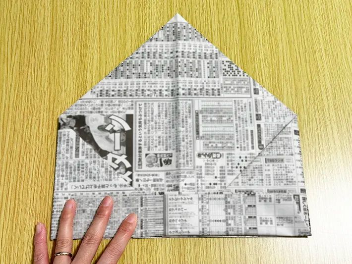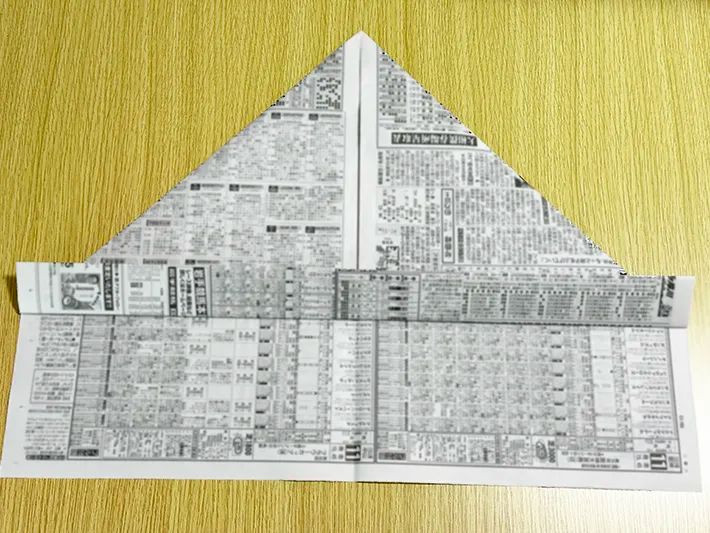 まず、新聞紙を折り目に沿って半分に畳みます。
