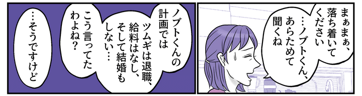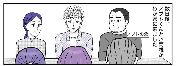 私はコハル。夫のキッペイと二人暮らしです。ある日娘のツムギ(23才)が困惑した様子で相談してきました。彼氏のノブトくんが「自分のカフェを開きたい」と言い出し、仕事を辞めて店を手伝ってほしいと要請してきたのだとか。しかしノブトくんの計画はツムギを犠牲にする前提です。私から話を聞いたノブトくんのお母さんも、あまりにずさんな考えに絶句しています。ツムギとノブトくん、そして双方の両親が同席しての話し合いの場が設けられました。