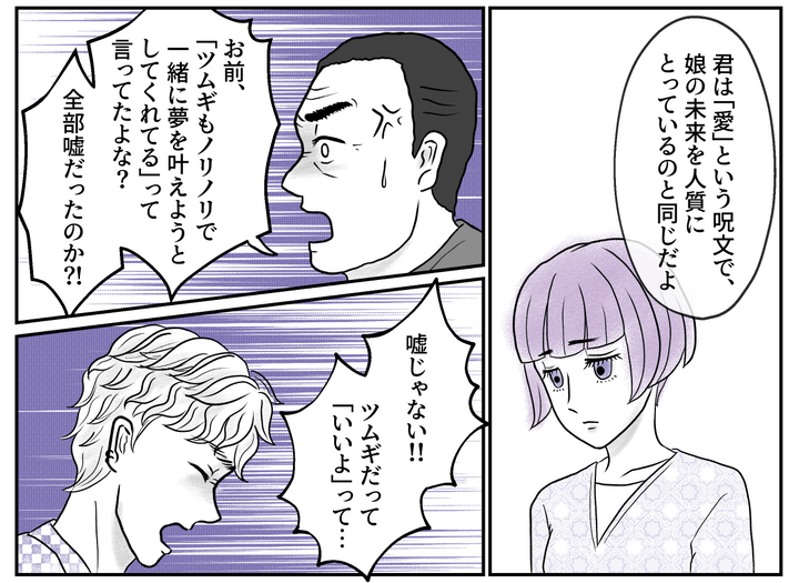 ご両親から叱りとばされ、ノブトくんはポツリとつぶやきます。「成功したら全部ツムギのために使うし、まずは2人で夢を追いかけたいって思ったんです。なのに最初から信用されてないみたいじゃないですか。愛があれば大丈夫なのに……」
