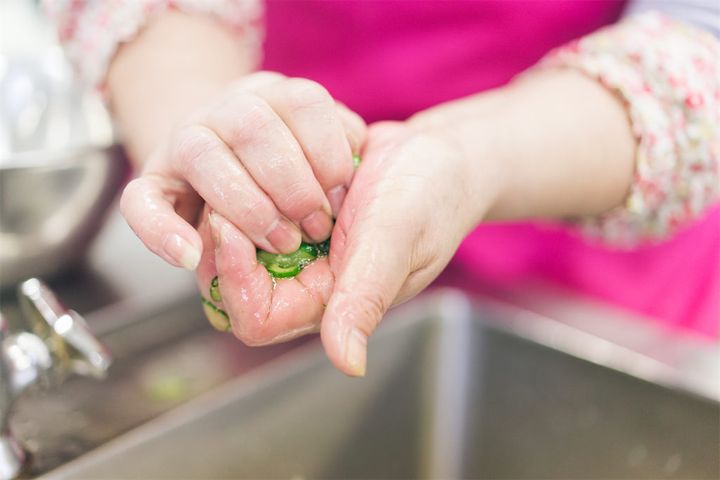 2. キュウリを水で洗って薄い輪切りにし、分量の塩でもみ、15分ほどおく。