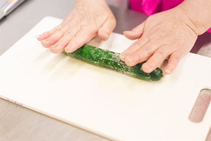 1. キュウリに塩(分量外)を少々ふり、板ずりする。