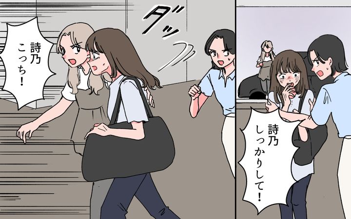 魁人は詩乃を貶めながら追い詰めてきました。詩乃は足がすくんで動けなくなったところを葉子が連れて行ってくれて…。私も捕まる寸前で、もう一人協力を依頼していた元同僚の田中さんが救ってくれました。