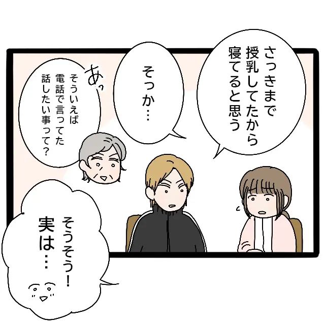 「あれ、先輩は?まだ2階?」そうたずねると、兄が「さっきまで授乳してたから寝てると思う」と教えてくれました。みずほ先輩、ずっとこもりきりで大丈夫かな。そんな不安がよぎったその時、母が「そういえば、電話で言ってた話したい事って?」と聞いてきました。
