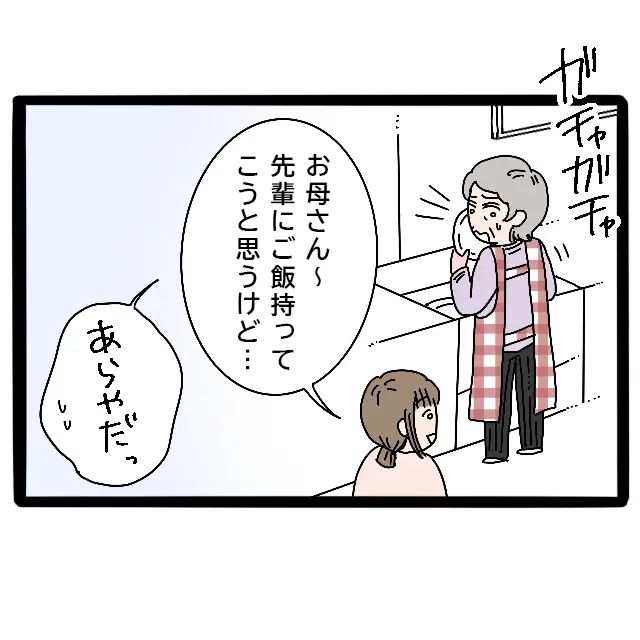 夕食を食べ終えたあと、つむちゃんの育児で2階にこもりきりのみずほ先輩のことが気になり、ご飯を持っていってあげようと思いました。後片付け中の母に「お母さん~先輩にご飯持ってこうと思うけど・・・」と声をかけると、母は「あらやだっ」と困ったような表情を浮かべます。