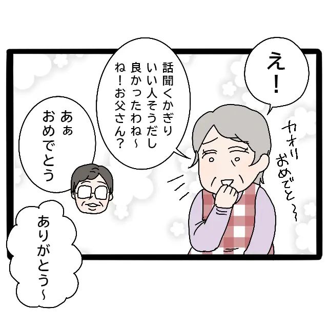 母は「カオリおめでと~話を聞くかぎりいい人そうだし、良かったわね~」と満面の笑みで喜んでくれました。普段は感情をあまり表に出さない父も、「あぁ、おめでとう」と嬉しそう。私は2人に「ありがとう~」と伝えました。