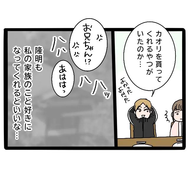 兄は「カオリを貰ってくれるやつがいたのか」と意地悪を言ってきましたが、その表情はどこか嬉しそうでした。隆明も私の家族のことを好きになってくれるといいな・・・家族と笑い合いながら、そんなことを思いました。
