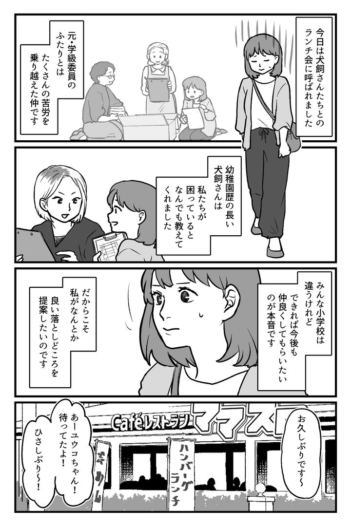 私はユウコ。この春、長男が卒園し、次男が入園しました。卒園から1か月後、ママ友の犬飼さんから同窓会の提案がありました。彼女は明るく行動力があり、保護者からも信頼されているムードメーカー。でも今回の計画には、園のルールに反する問題があり、私は悩んでいます。今日は犬飼さんとほかのママ友とランチを兼ねた企画会議。先生を巻き込まない形なら賛成ですが、ルール違反は避けたいのが本音です。みんな通園歴が長く、園のルールもよく知っているはず。和やかな雰囲気の中で、なんとか犬飼さんを説得したいと思っています。