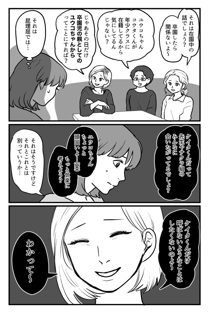 私は心の中で、「ママさんたち、いつもの冷静さがない気がする……」と感じていました。その後も、「ちょっと頭固くない?」「ケイタくんだけ呼ばないようなことはしたくない」など、遠回しに協力を求められるような言葉が続きました。