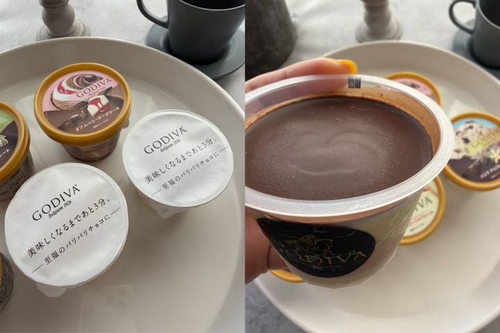 冷凍庫から出したばかりのカップはまだカチカチなので「3分」待ってから食べるのが美味しさを引き出す秘訣です。少しずつカップの縁が溶け始め、アイスが柔らかくなったら食べ頃!チョコのパリパリとアイスのなめらかな食感が堪りません。ゴディバ自慢の芳醇なカカオの香りが口いっぱいに広がります♡
