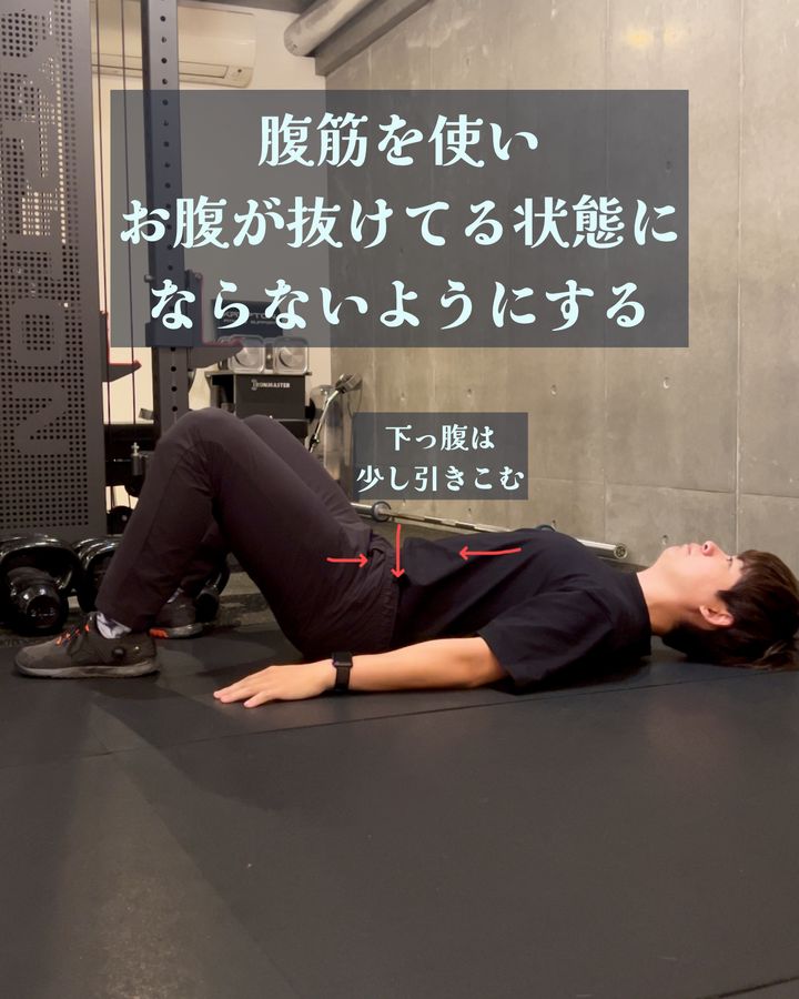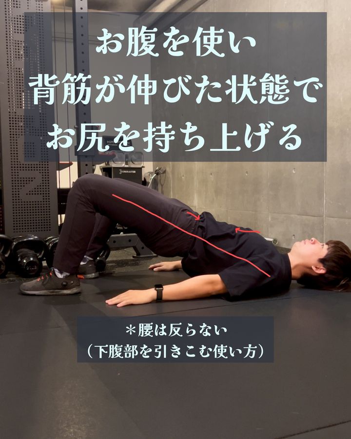 2.腰を反らないように注意しながら、お尻を持ち上げて肩から膝までを一直線に保ちます
