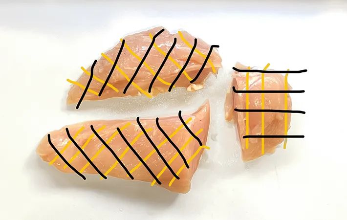 しかし、実はもっと手前にある『切り方』1つで、鶏むね肉の食感は大きく変わるのです。