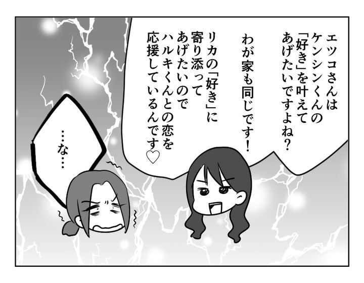 きっとあらかじめ練っていた作戦ではなかったことでしょう。けれど意外に一理ある戦法かもしれません。エツコさんがケンシンくんの気持ちを叶えてあげようとするのであれば、同じようにナツキさんもリカちゃんの気持ちを大切にする。エツコさんと同じことをしている分、一番分かりやすく伝わるのではないでしょうか? でもエツコさんの顔……何やら険悪ですね……(汗)。