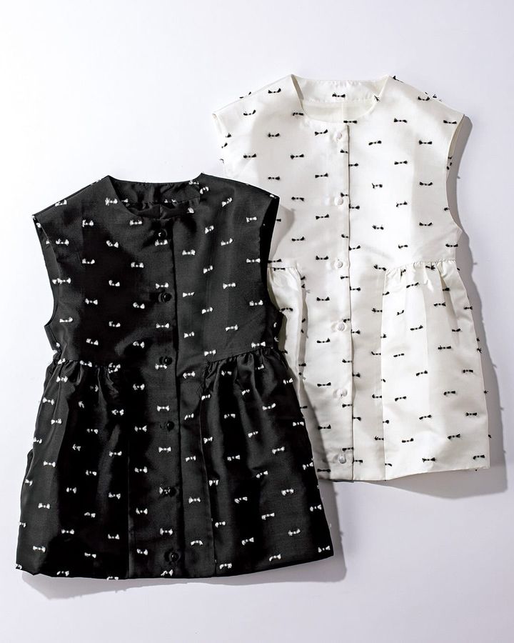 光沢のあるジャカード素材にミニリボンのようなデザインを施した華やかなジレ。デニムを合わせれば大人カジュアルなコーデも楽しめます。自宅でのお洗濯も可能。パッと目を引く高級感と華やかさがあるジャカード素材で一層コーデが華やかに。