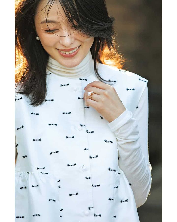 ➀デニムを合わせれば大人カジュアルなコーデも楽しめる「リボンデザインジレ」