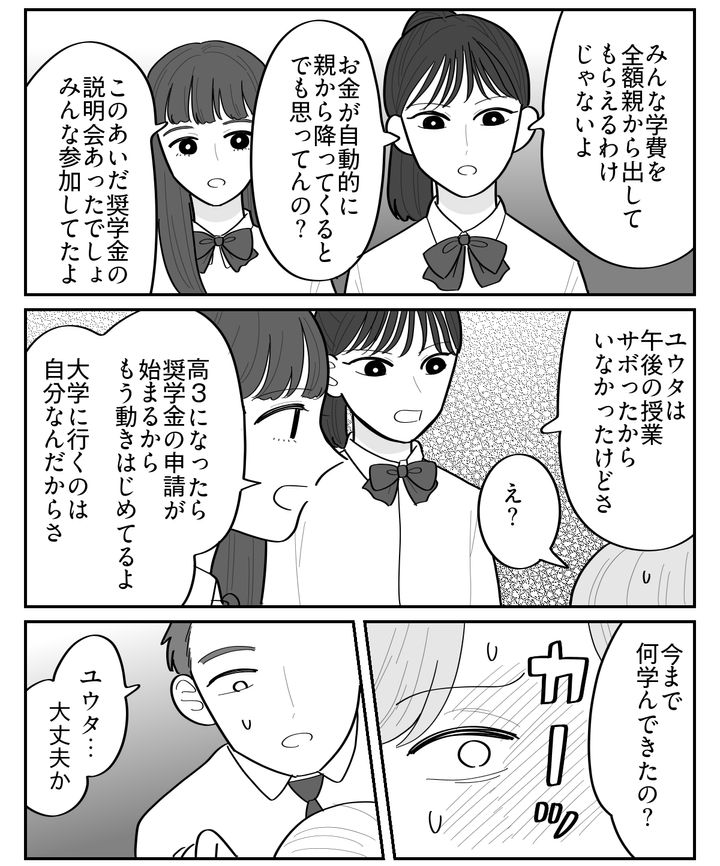 どうやら先日、奨学金についての説明会があったらしい。みんな参加していたと言われ、青ざめた。今まで一緒に遊んで、バカやって盛り上がっていたヤツらが、どんどん俺を置き去りにしていく……。俺はそんな不安と焦りに襲われた。
